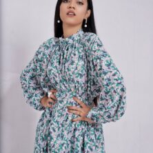 A Sairish Kaftan set set with adjustable ribbon attached to fit according to ones preference. Perfect for a dawat or casual wear. Anyone below bust 50 inches can fit in. Modest.